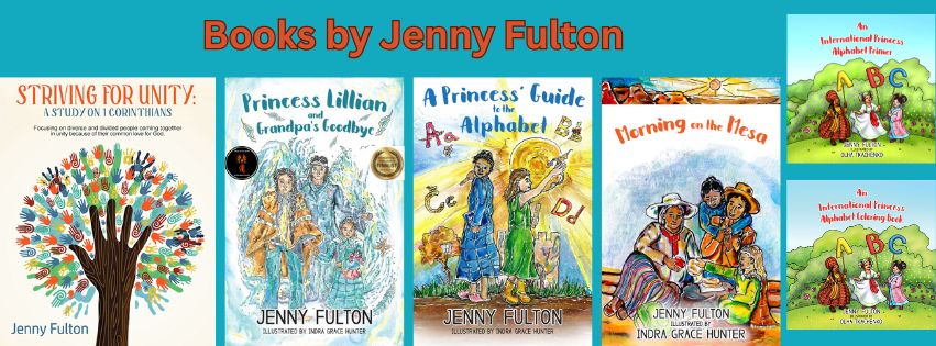 *Morning on the Mesa, *An International Princess Alphabet Primer, *An International Princess Alphabet Coloring Book, *Striving for Unity: a Study on 1 Corinthians, *A Princess’ Guide to the Alphabet, *Princess Lillian and Grandpa’s Goodbye, *Invisible Battles: The Quest for Hope