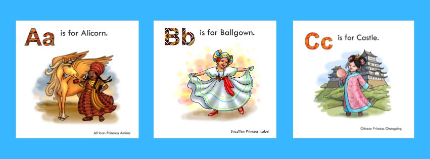 Learn the alphabet with princesses from countries and cultures around the world. Each unique girl, dressed in traditional clothing, presents a letter of the alphabet with fun princess and fantasy themed words and pictures.
